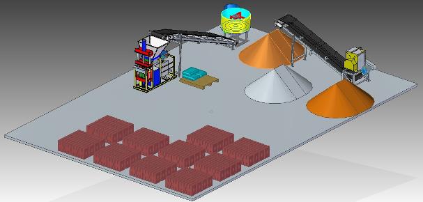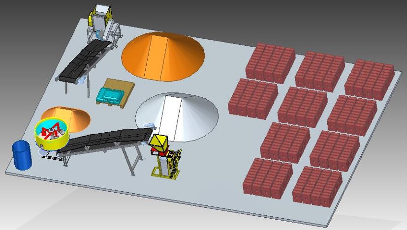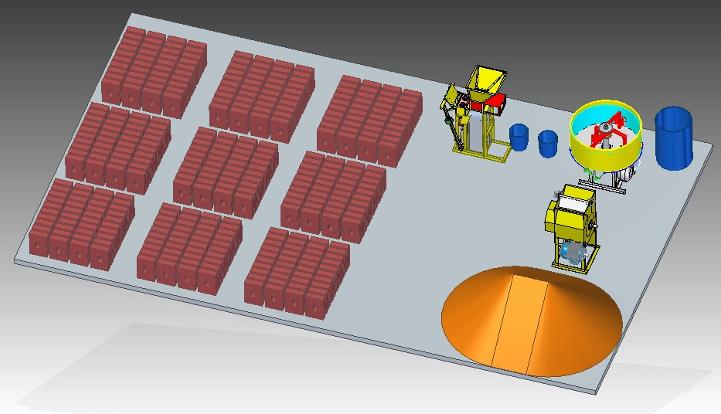 Esta planta utiliza un área de 12x8 metros cuadrados y con 4 trabajadores puede producir 2000 adobes diarios Esta planta considera el espacio para almacenar el suelo, la arena, el cemento y el suelo desterronado que queda junto a la mezcladora, de este patio de mezclas se cargan manualmente a la mezcladora los ingredientes. Los baldes o recipientes también son importantes para dosificar cada ingrediente. |