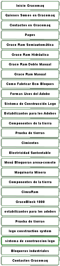 1– Prensa manual GracoRam Manual 1- Mazo o pisón para desterronar el suelo 1- Malla para zarandear el suelo 2- Palas para mezclar el suelo y el cemento 2– Baldes o recipientes para dosificar el suelo y el cemento 1– Tanque pequeño para el agua (tambor de 200 litros)